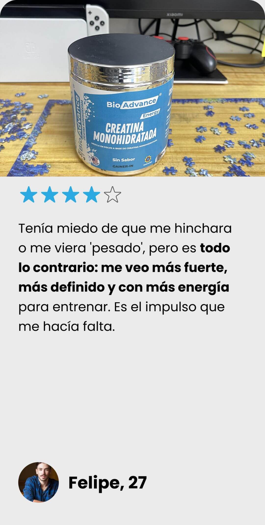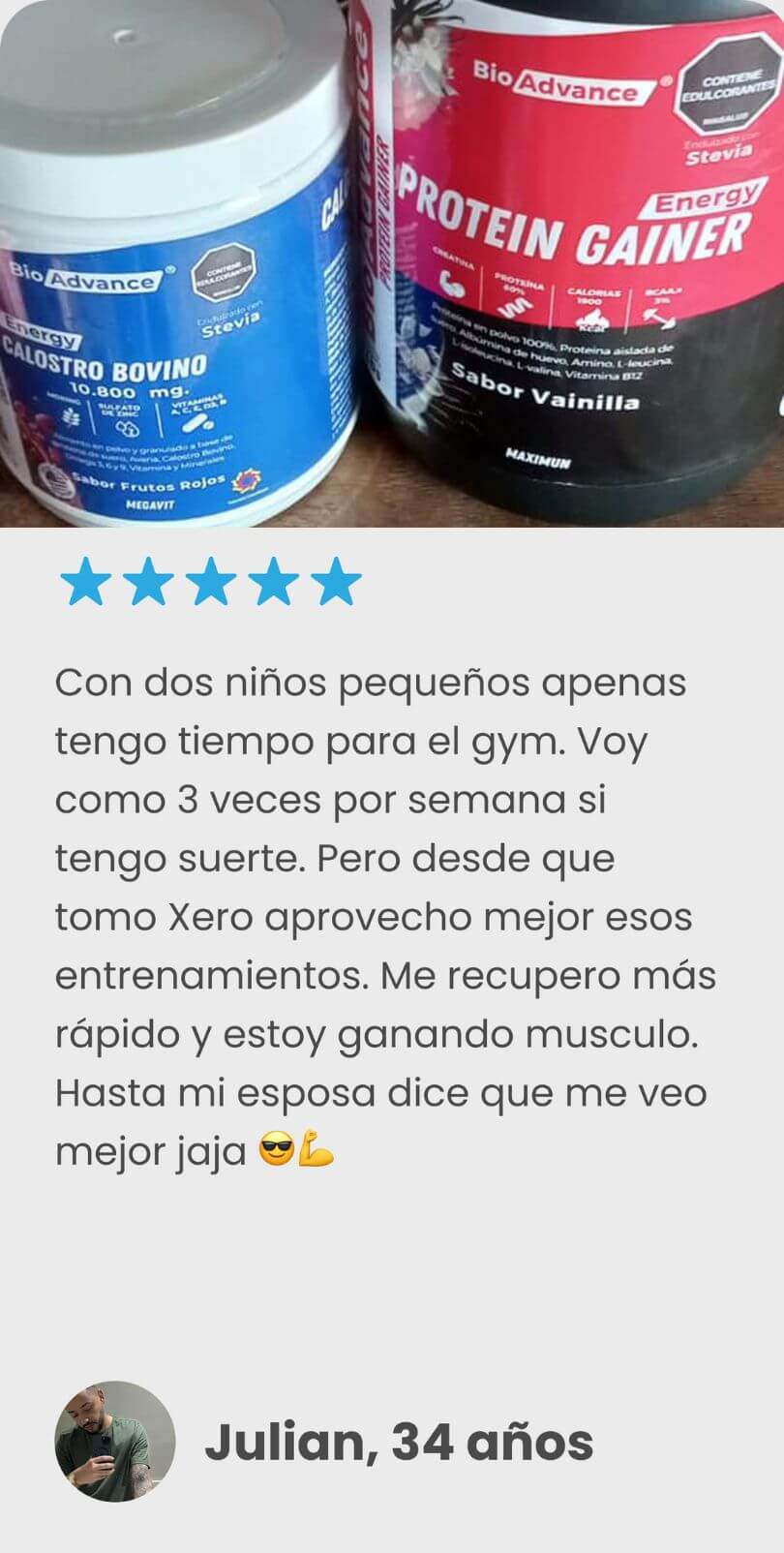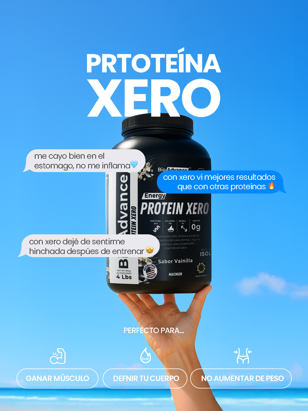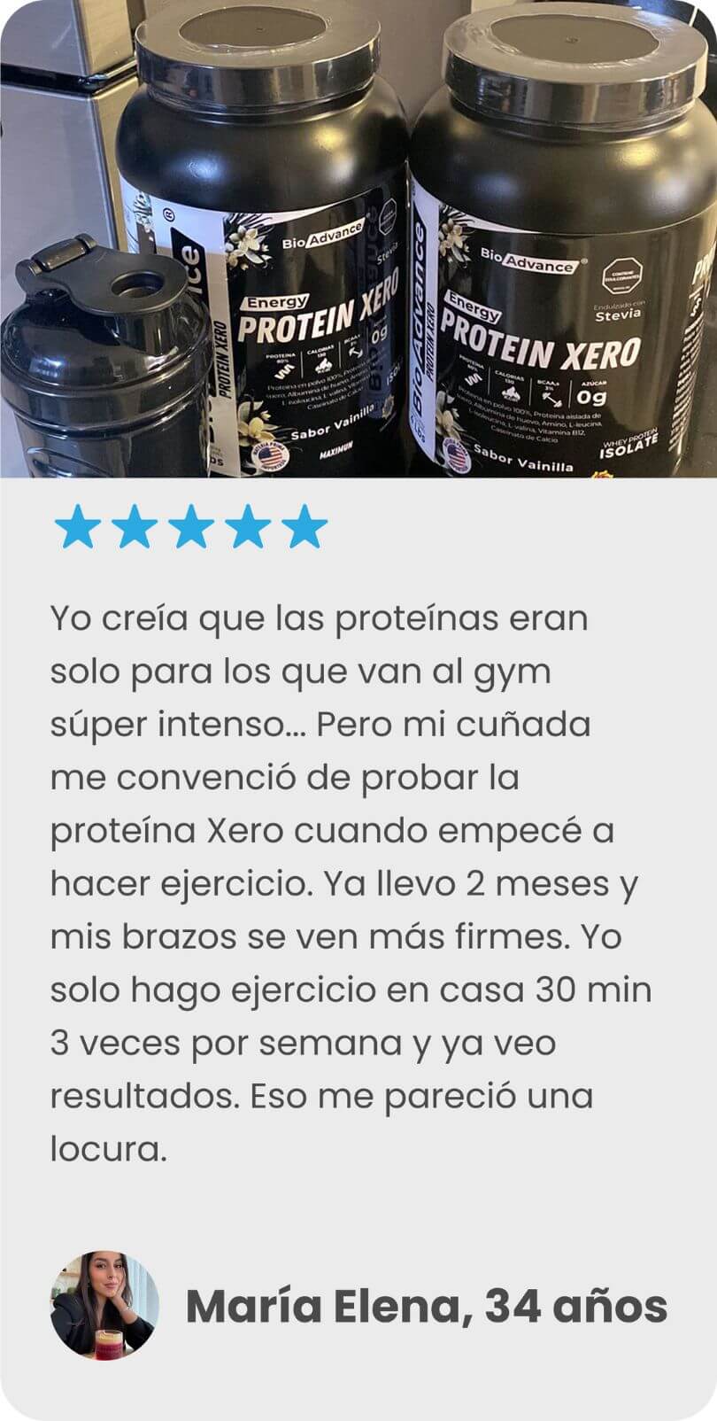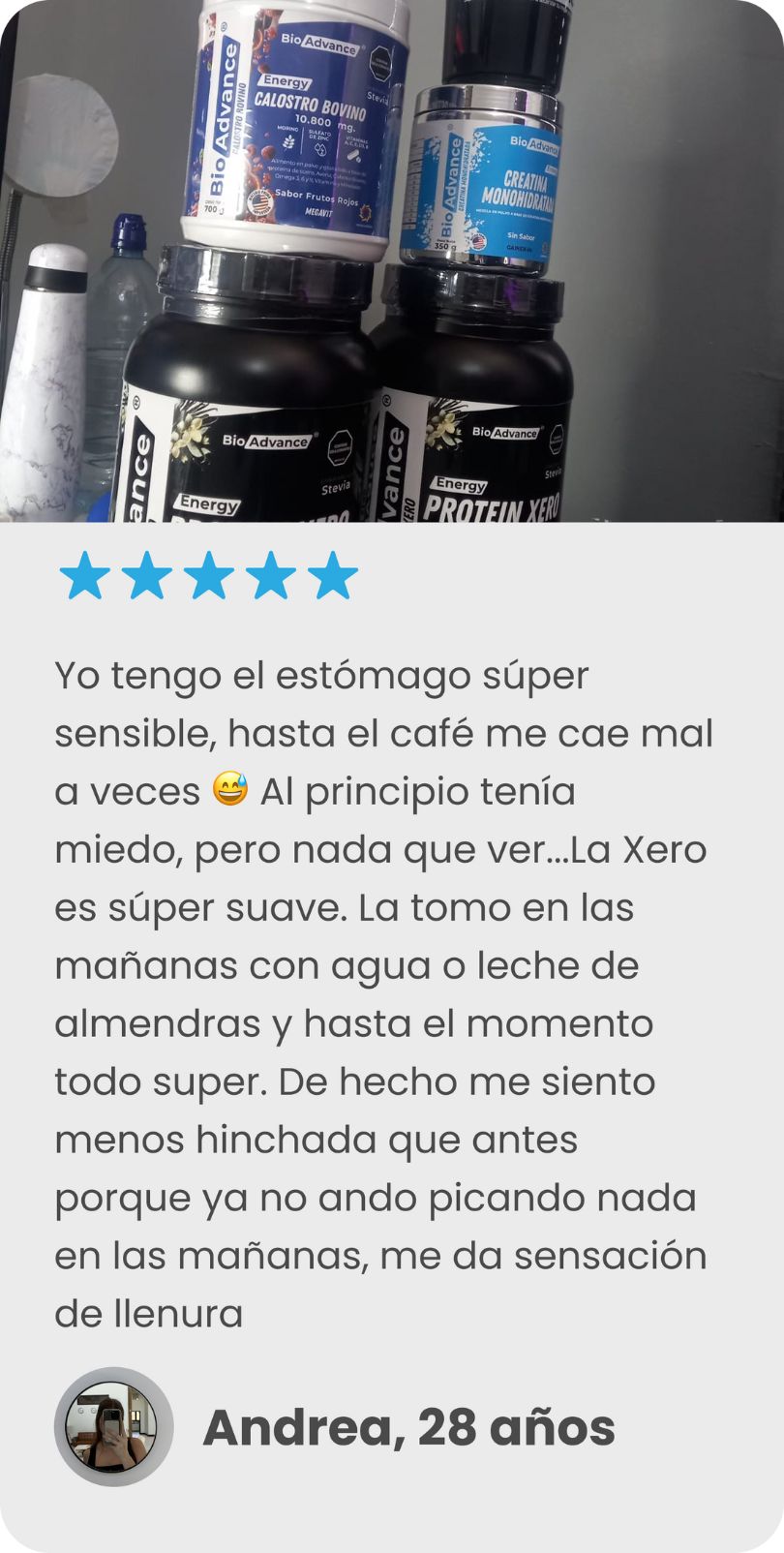 Nota: Resultados basados en experiencias de usuarios y pruebas de uso de la Proteína Xero BioAdvance. Los resultados pueden variar según el tipo de cuerpo, metabolismo, nivel de actividad física y constancia en el plan nutricional.